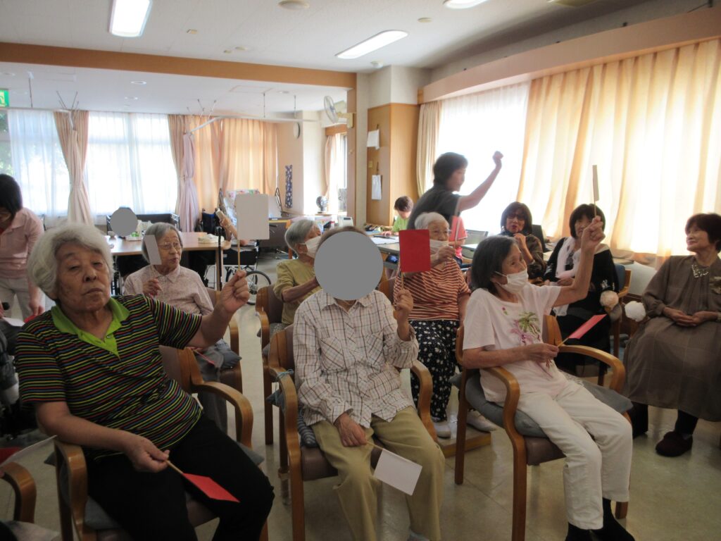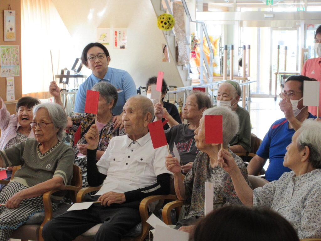 日頃からレクリエーションや帰りの車に乗車いただくまでなどにカラオケをお楽しみいただいているのですが、利用者様に紅組・白組に分かれていただき、歌を披露。最後はどちらの組が良かったか観覧の利用者様に選んでいただき、勝敗が付く形とさせていただきました(^_^)