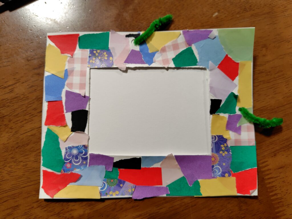 まずはフレーム枠にちぎった折り紙を貼り付けていきました。